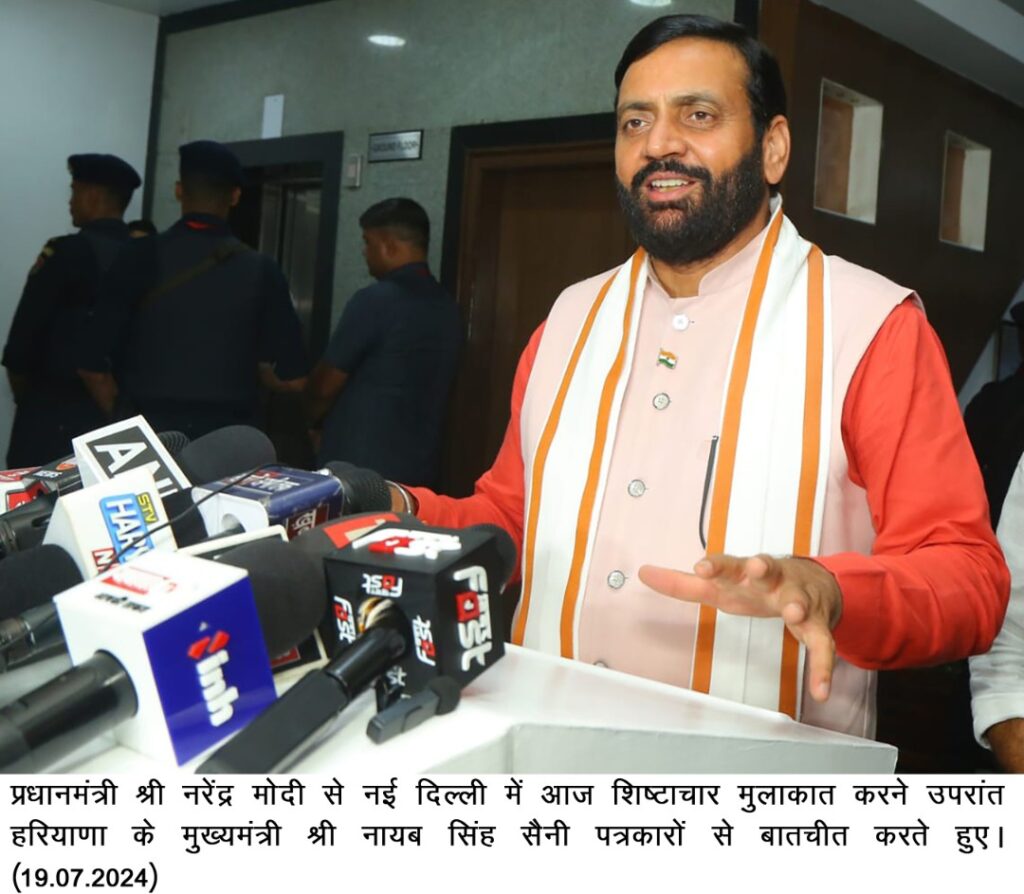 चंडीगढ/संघोल-टाइम्स/नागपाल/19जुलाई,2024- प्रधानमंत्री श्री नरेन्द्र मोदी से हरियाणा के मुख्यमंत्री नायब सिंह सैनी ने प्रधानमंत्री आवास पर मुलाकात कर हरियाणा में चलाई जा रही योजनाओं की जानकारी दी। प्रधानमंत्री ने मुख्यमंत्री से अग्निवीर व प्रदेश व केन्द्र सरकार द्वारा गरीब कल्याण के लिए चलाई जा रही योजनाओं पर विस्तार से चर्चा की।