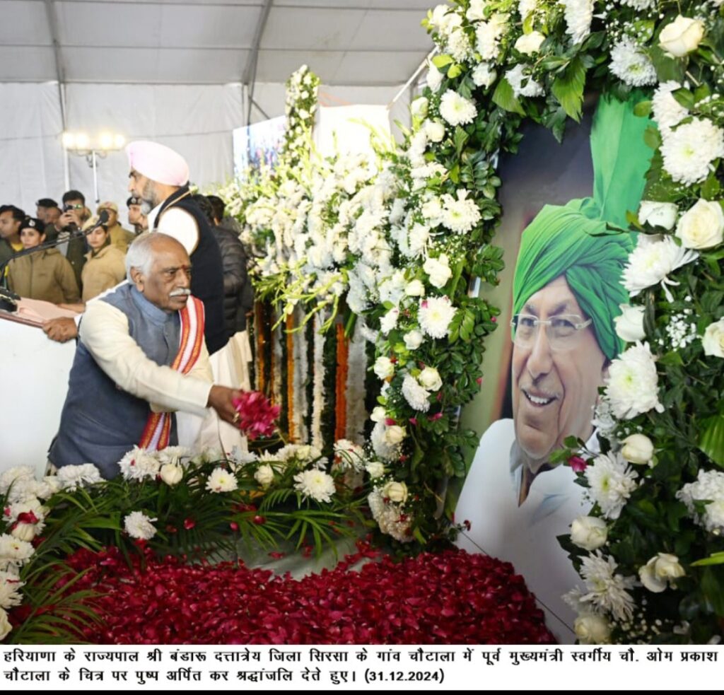 Chandigarh/SANGHOL-TIMES//Harminder Nagpal,Jagmeet Singh/31 दिसंबर,2024- हरियाणा के राज्यपाल बंडारू दत्तात्रेय ने मंगलवार को गांव चौटाला के साहिब राम स्टेडियम में पूर्व मुख्यमंत्री स्वर्गीय ओमप्रकाश चौटाला को श्रद्धांजलि अर्पित की। राज्यपाल ने कहा कि ओमप्रकाश चौटाला महान व्यक्तित्व के धनी थे। प्रदेश की प्रगति में उनके योगदान को हमेशा याद रखा जाएगा। हरियाणा में पानी के लिए जो संघर्ष उन्होंने किया वो इतिहास में दर्ज है। उन्होंने कहा कि जब वे केंद्र में शहरी विकास मंत्री थे और ओमप्रकाश चौटाला हरियाणा के मुख्यमंत्री थे, उस दौरान एनसीआर की प्रांतीय बैठकों में ओमप्रकाश चौटाला ने न केवल एनसीआर प्रांत की मांगों को केंद्र के समक्ष रखा, बल्कि उन्हें पूरा भी करवाया। इस प्रकार से एनसीआर के प्रांतों में हरियाणा को अग्रणी बनाने में उनका अहम योगदान रहा है।