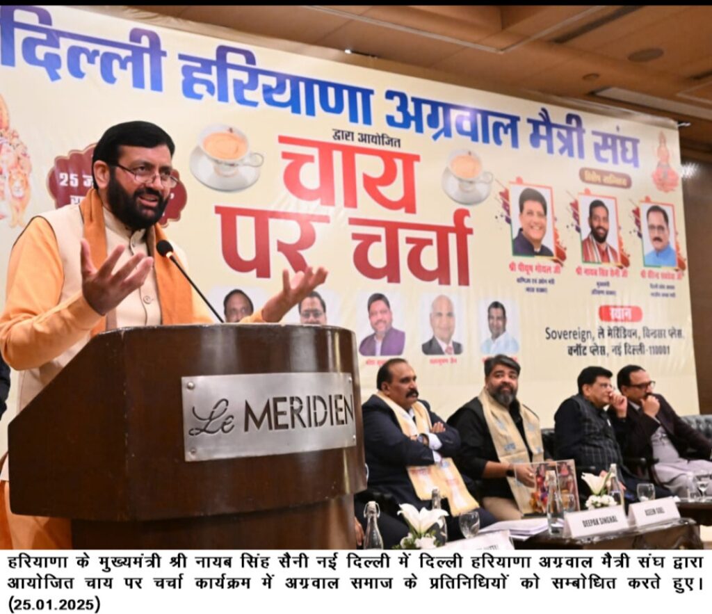 चंडीगढ़/SANGHOL-TIMES/HARMINDER-NAGPAL/JAGMEET-SINGH/25 जनवरी,2025 – हरियाणा के मुख्यमंत्री श्री नायब सिंह सैनी ने कहा कि महाराजा अग्रसेन का युग हम सबको प्रेरणा देता है। मुझे यह बताते हुए खुशी हो रही है कि अग्रोहा धाम के टीले की खुदाई की आवश्यक अनुमति मिल गई है। हरियाणा सरकार ने आगामी प्रक्रिया को आरंभ करने के लिए एक कमेटी का भी गठन कर दिया है। साथ ही आगामी बजट में इसके लिए धनराशि का प्रावधान भी कर दिया जाएगा। उन्होंने यह बात आज शाम नई दिल्ली के ली मेरिडियल होटल में दिल्ली हरियाणा अग्रवाल मैत्री संघ द्वारा आयोजित चाय पर चर्चा कार्यक्रम को संबोधित करते हुए कही। केंद्रीय उद्योग एवं वाणिज्य मंत्री श्री पीयूष गोयल भी कार्यक्रम में विशेष तौर पर पहुंचे थे। केंद्रीय मंत्री ने मुख्यमंत्री श्री नायब सिंह सैनी को उनके जन्मदिन की शुभकामनाएं भी दी।