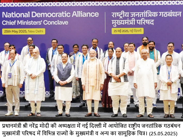 मुख्यमंत्री ने आज नई दिल्ली में प्रधानमंत्री श्री नरेन्द्र मोदी की अध्यक्षता में राष्ट्रीय जनतांत्रिक गठबंधन (एनडीए) के मुख्यमंत्रियों और उप मुख्यमंत्रियों की बैठक में यह बात कही। इस बैठक में ऑपरेशन सिंदूर में सशस्त्र बलों के पराक्रम और प्रधानमंत्री नरेंद्र मोदी के साहसी नेतृत्व की प्रशंसा करते हुए एक प्रस्ताव भी पारित किया गया। प्रधानमंत्री श्री नरेंद्र मोदी के साथ केंद्रीय गृह मंत्री श्री अमित शाह, रक्षा मंत्री श्री राजनाथ सिंह और बीजेपी के राष्ट्रीय अध्यक्ष श्री जगत प्रकाश नड्डा भी इस एक दिवसीय सम्मेलन में शामिल हुए।
